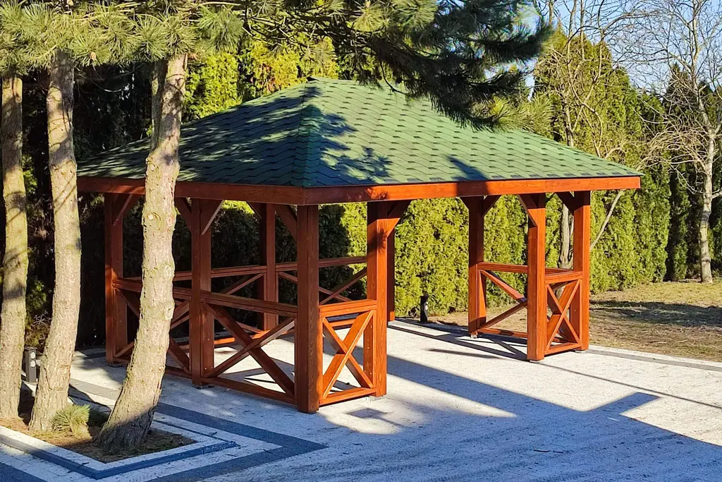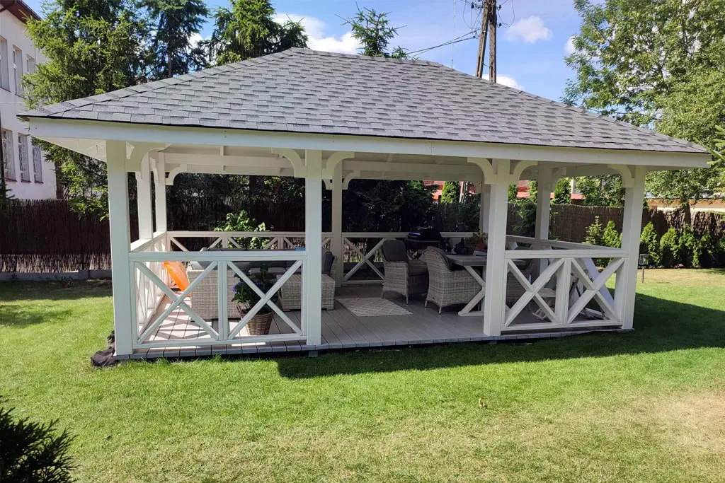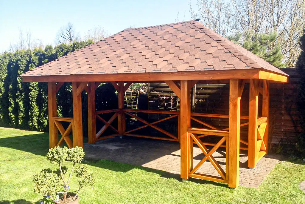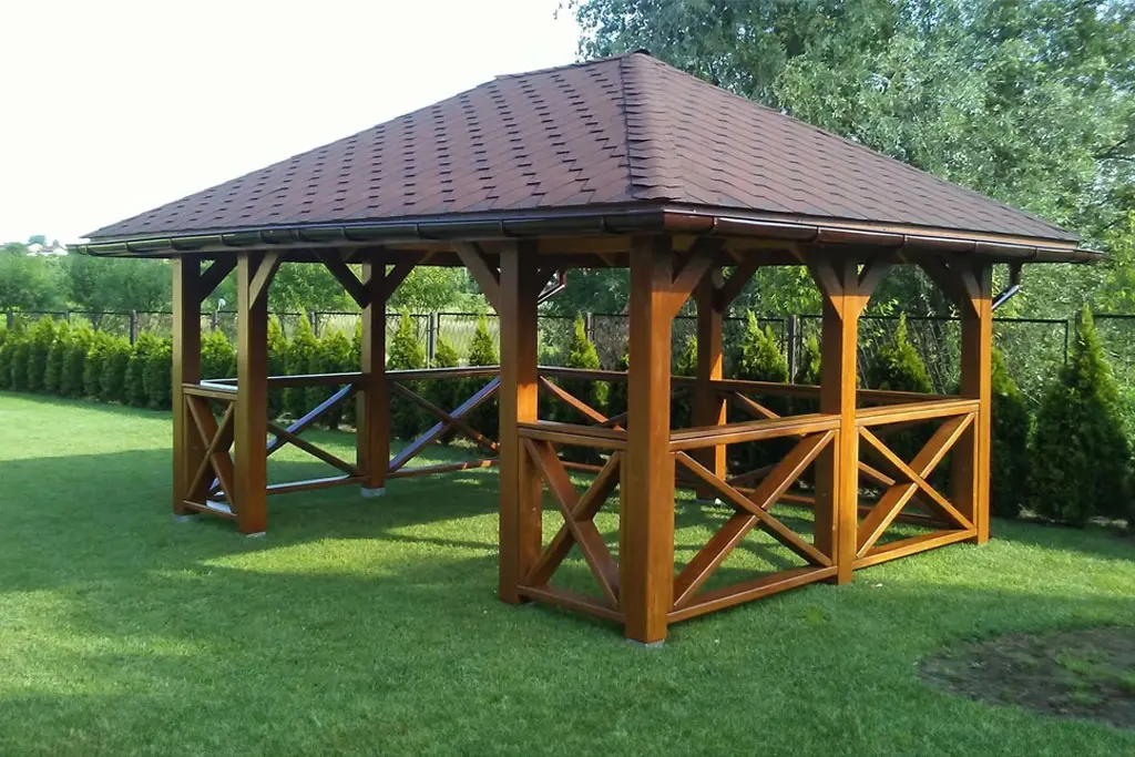 Jej solidna konstrukcja opiera się na słupkach z drewna klejonego o przekroju 15 cm x 15 cm, co gwarantuje trwałość i stabilność. Dach wykonany jest z deski suszonej, struganej z wyrobieniem pióra i wpustu o grubości 2,2 cm, dodatkowo pokryty gontem bitumicznym.
