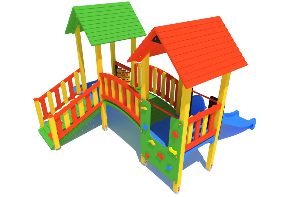 Wieża 2szt., trep wejściowy, ślizg, podest, mostek drewniany łukowy, gra kółko-krzyżyk, ścianka wspinaczkowa