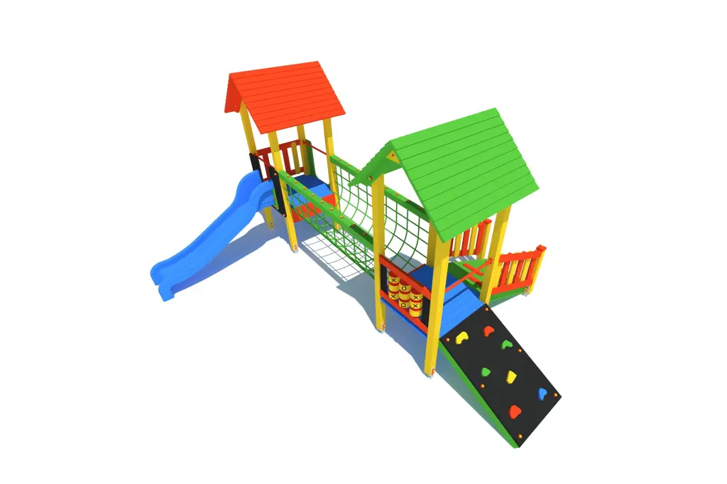 Wieża 2szt., trep wejściowy, ślizg, mostek linowy, gra kółko-krzyżyk, ścianka wspinaczkowa 2 szt.