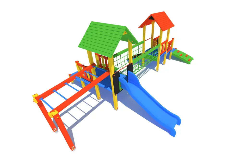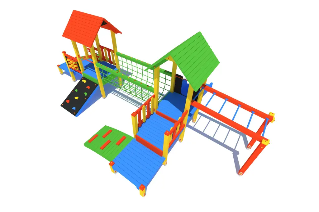 Wieża 2szt., trep wejściowy 2 szt., ślizg, gra kółko-krzyżyk, gra liczydło, ścianka wspinaczkowa, podest 4 szt., drabinka pozioma, mostek linowy