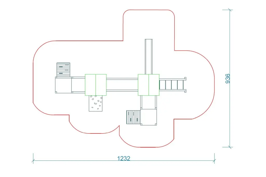 Zestaw K22-1 posiada imponujące wymiary: 8,90 m szerokości 5,85 m długości oraz 3,29 m wysokości. Strefa bezpieczeństwa o wymiarach 12,32 x 9,36 m oraz maksymalna wysokość swobodnego upadku 1,75 m gwarantują spełnienie najwyższych standardów bezpieczeństwa, zgodnie z normą PN-EN 1176:2017.