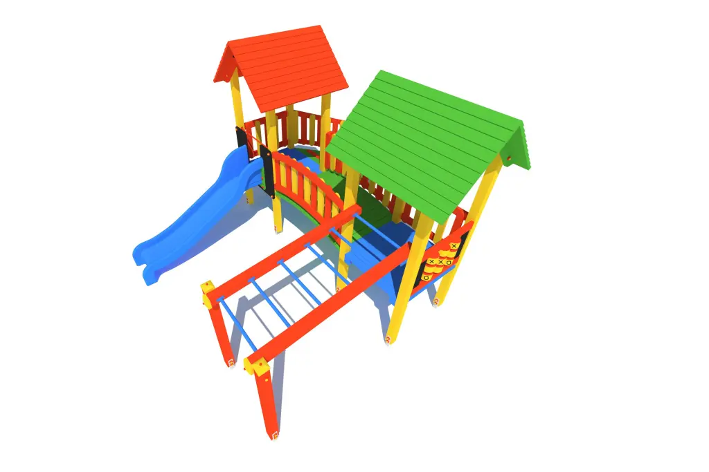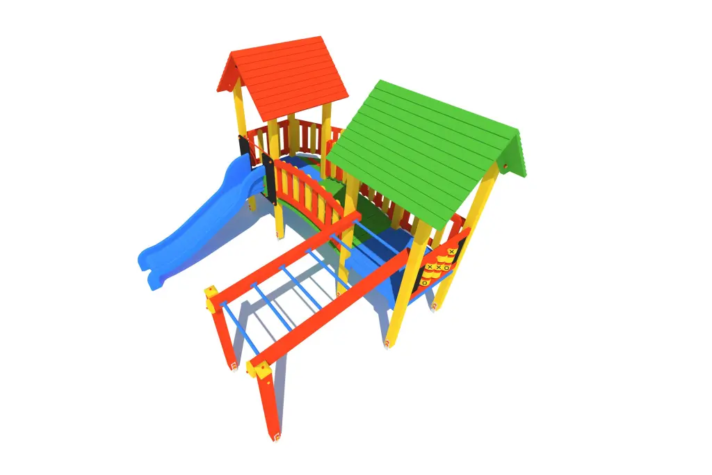 Wieża 2 szt., ślizg, trap wejściowy, gra kółko – krzyżyk, drabinka pozioma, mostek drewniany łukowy