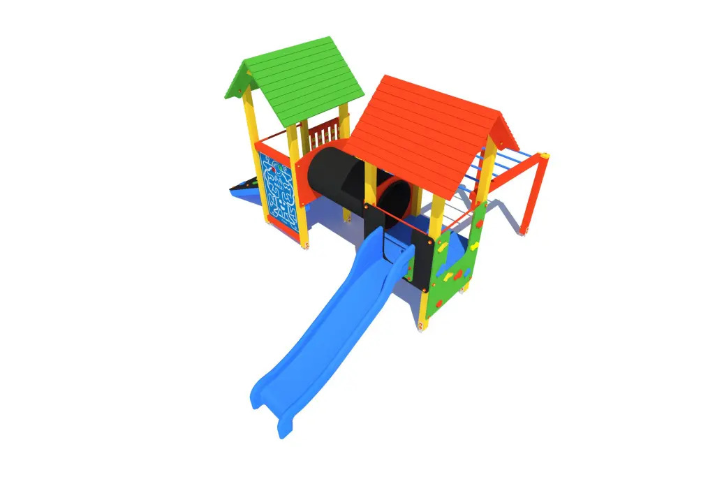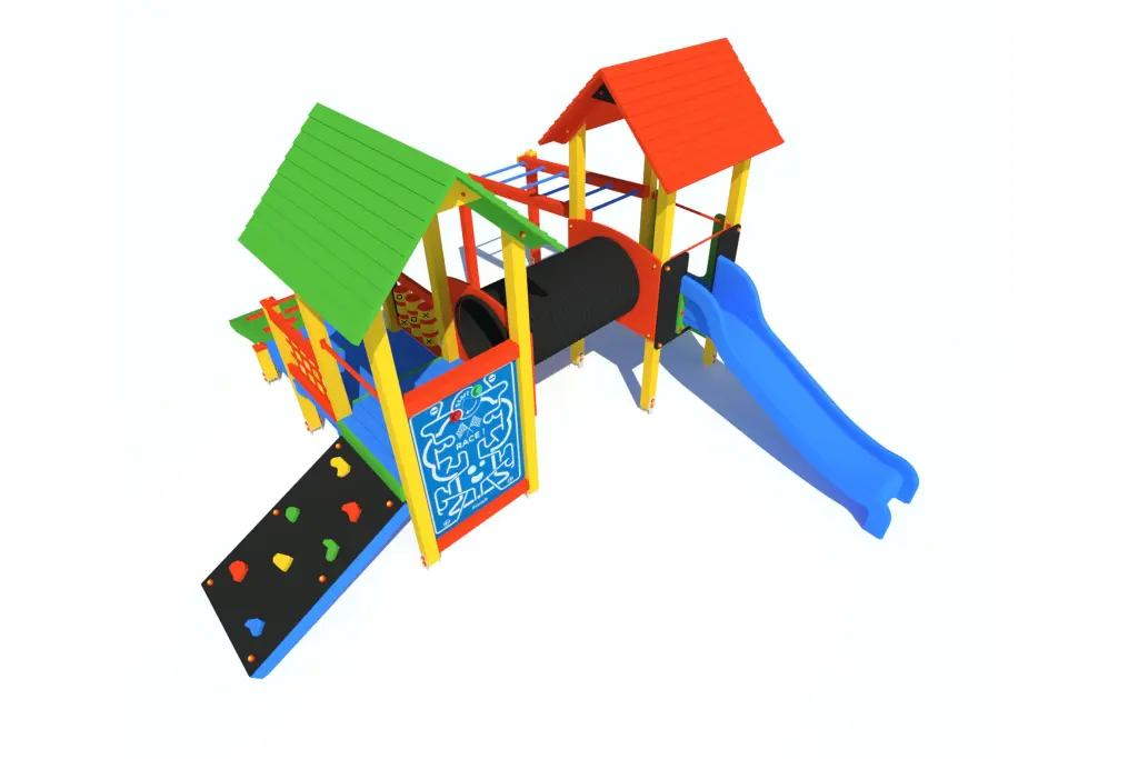Wieża 2szt., trep wejściowy, ślizg, gra kółko-krzyżyk, ścianka wspinaczkowa 2 szt., podest 2 szt., gra angielskie słówka, gra wyścig, tunel, drabinka pozioma