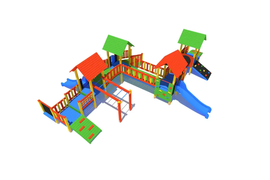 Wieża 4 szt., trep wejściowy 3 szt., ślizg 3 szt., gra kółko-krzyżyk, gra liczydło, podest 4 szt., gra angielskie słówka, tablica kredowa 2 szt., drabinka pozioma, mostek drewniany łukowy, mostek drewniany prosty, ścianka wspinaczkowa 2 szt., tunel