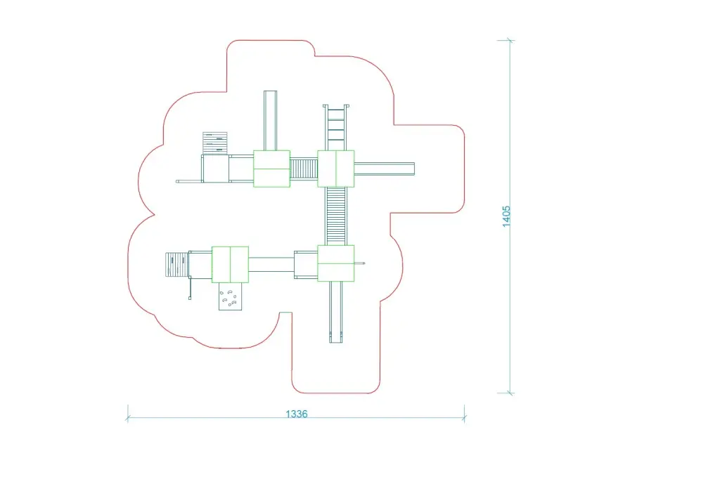 Zestaw K33-1 posiada imponujące wymiary: 9,85 m szerokości, 10,02 m długości oraz 3,29 m wysokości. Strefa bezpieczeństwa o wymiarach 13,36 x 14,05 m oraz maksymalna wysokość swobodnego upadku 1,76 m gwarantują spełnienie najwyższych standardów bezpieczeństwa, zgodnie z normą PN-EN 1176:2017.
