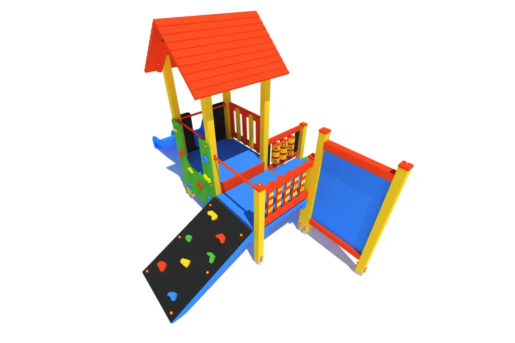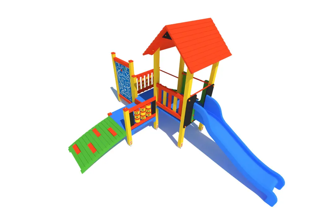 Wieża, trep wejściowy, ślizg, podest 2 szt., ścianka wspinaczkowa 2 szt., gra kółko-krzyżyk, gra angielskie słówka, gra wyścig
