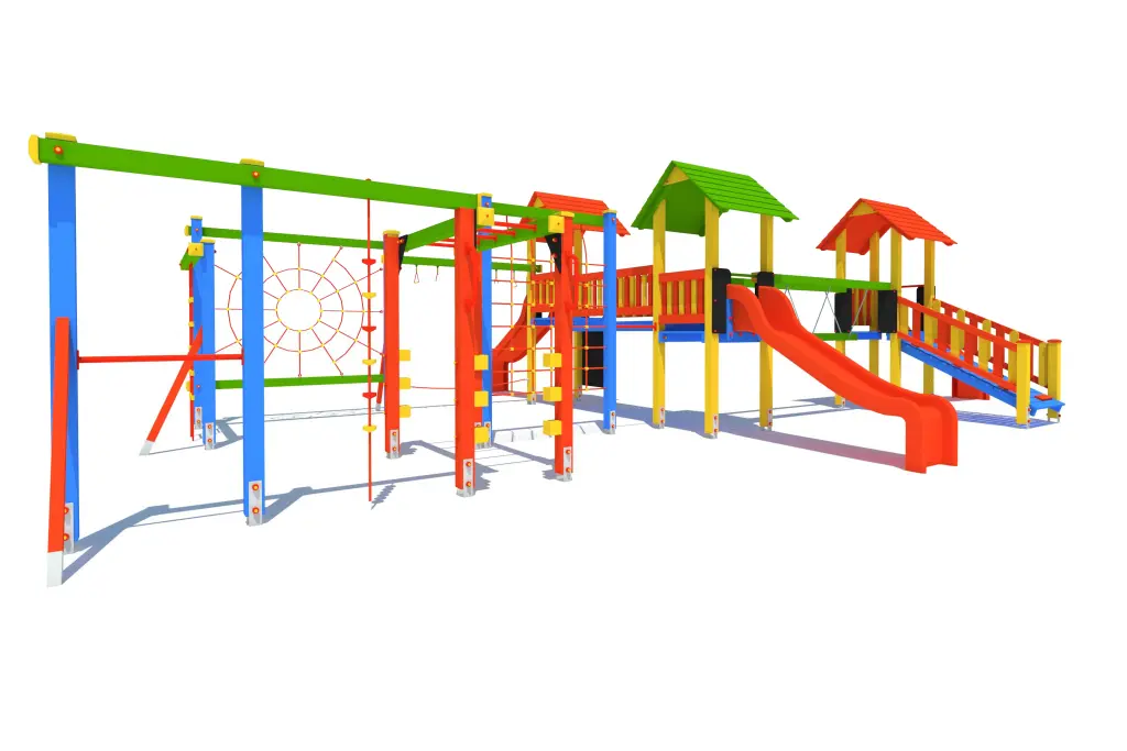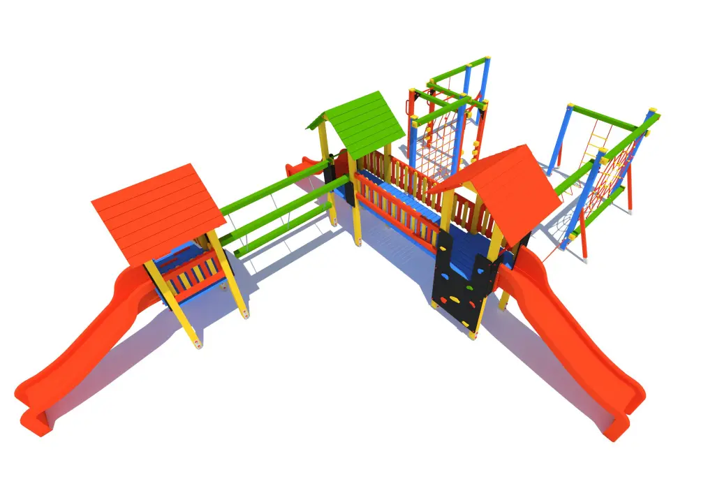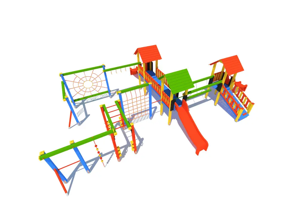 Zestaw zabawowy P76 to imponująca konstrukcja dla dzieci w wieku od 3 do 14 lat, oferująca różnorodne możliwości zabawy, takie jak wspinanie, zjeżdżanie, balansowanie i podciąganie. Wyposażony w wieże, ślizgi, drabinki, siatki wspinaczkowe, mostek, trapy wejściowe, równoważnie, drążki metalowe, pajęczą sieć, linę wspinaczkową oraz uchwyty do podwieszania, zapewnia rozwój motoryczny i niezapomniane chwile zabawy. Konstrukcja wykonana z trwałego drewna klejonego warstwowo oraz odpornych na warunki atmosferyczne materiałów, malowana farbami akrylowymi, gwarantuje bezpieczeństwo i długą żywotność. Produkt spełnia normy PN-EN 1176:2017 i PN-EN 1177:2009, idealnie nadając się na place zabaw w przestrzeni publicznej.
