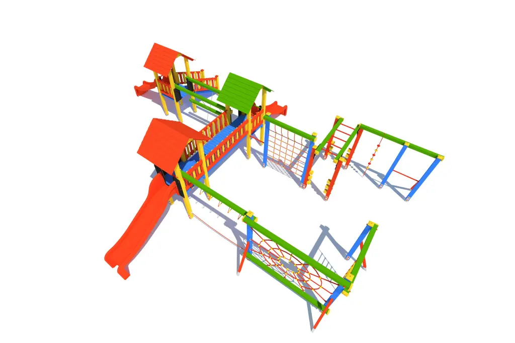 Wieża 3 szt., trep wejściowy, ślizg 3 szt., równoważnia, drążek metalowy 2 szt., lina wspinaczkowa, mostek drewniany prosty, siatka z liny, drabinka pozioma, pajęcza sieć, drabinka z liny, uchwyty z liny.