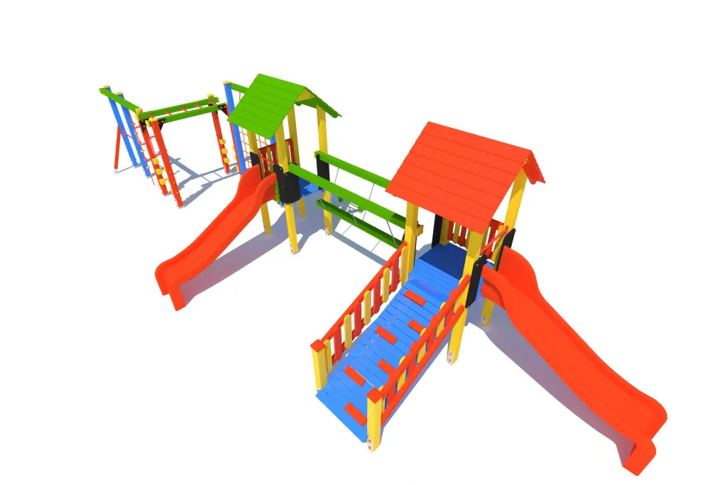 Wieża 2 szt., trap wejściowy, ślizg 2szt., równoważnia, drążek metalowy 2 szt., lina wspinaczkowa, ścianka z liny, drabinka pozioma, drabinka pochyła