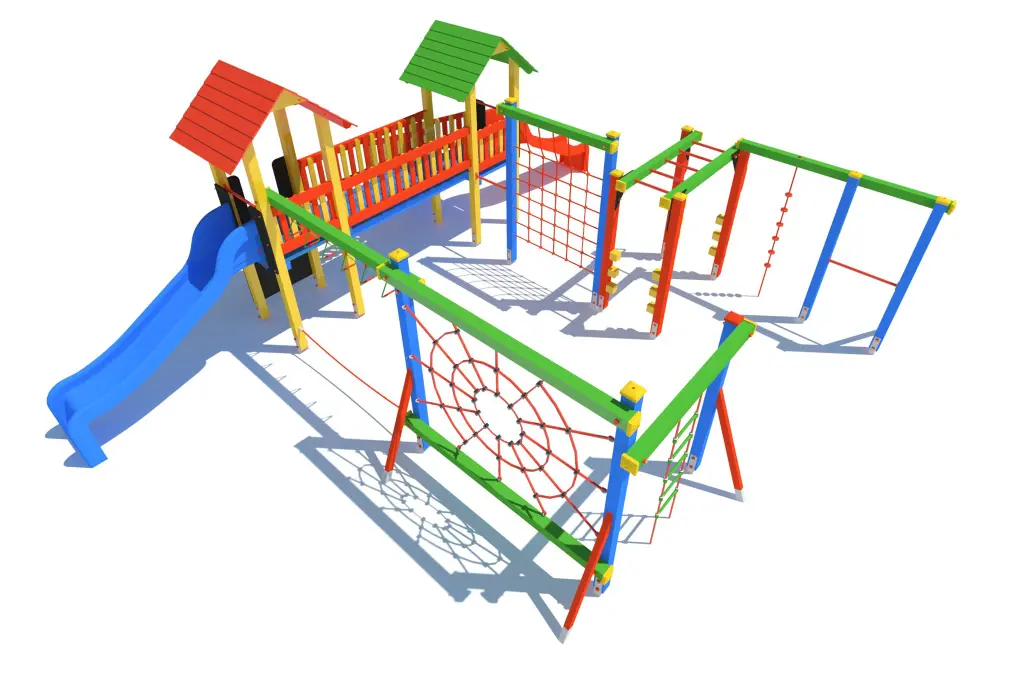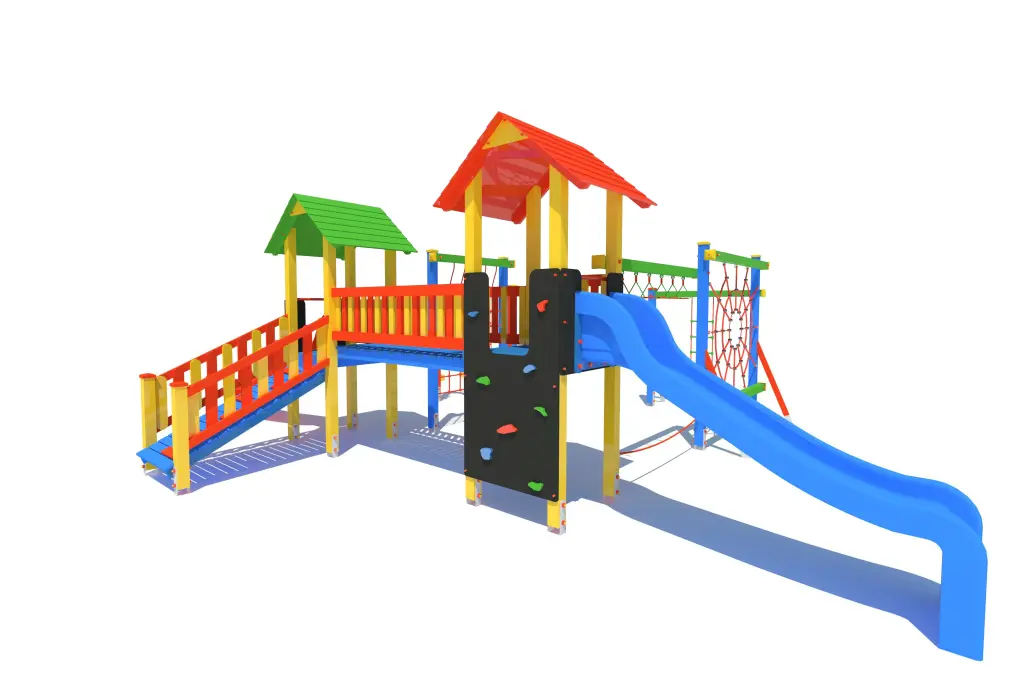 Zestaw zawiera dwa ślizgi, dwie wieże oraz szeroki wachlarz elementów wspinaczkowych i balansowych: