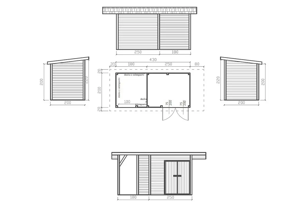 Ściany zadaszenia zabudowane deską suszoną, struganą, układaną poziomo z odstępami.
