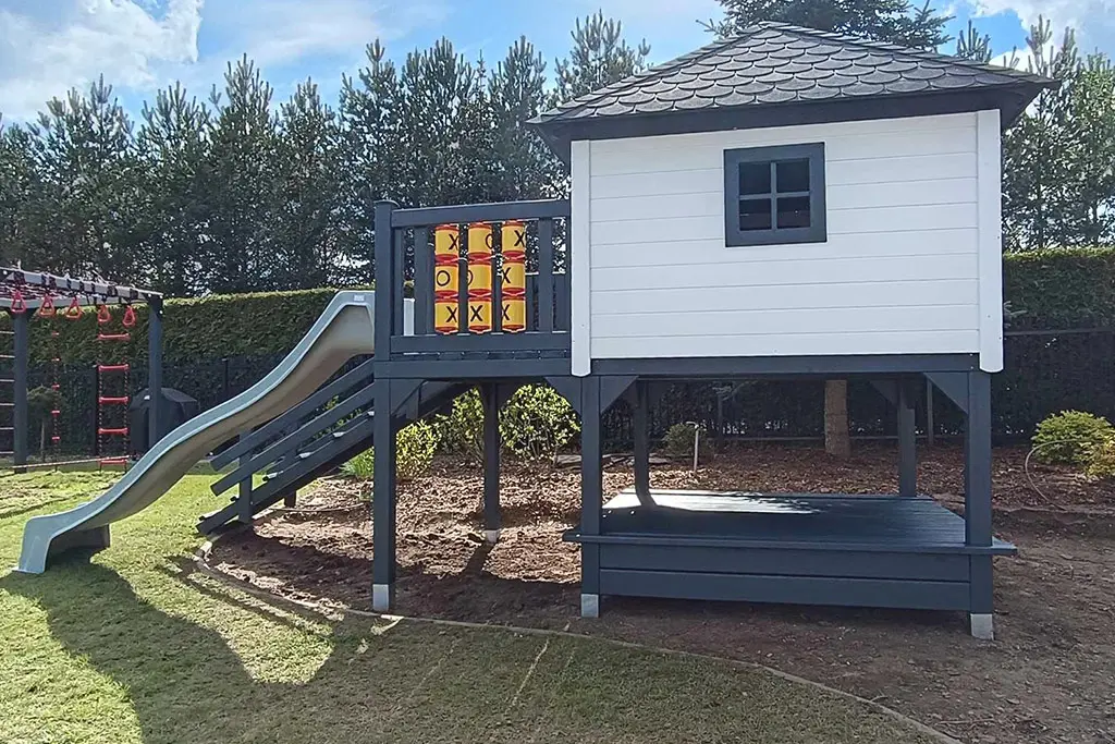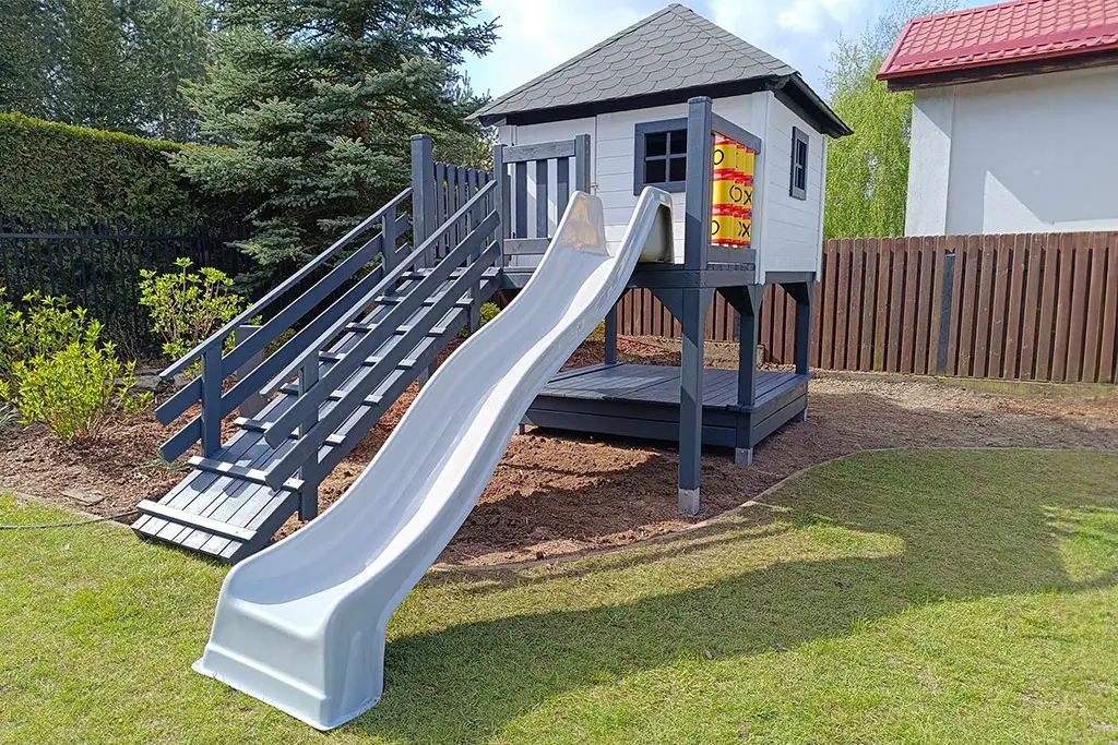Domek z daszkiem krytym gontem, trap wejściowy z poręczami, taras, zjeżdżalnia z niską burtą, piaskownica z przykryciem pod domkiem.