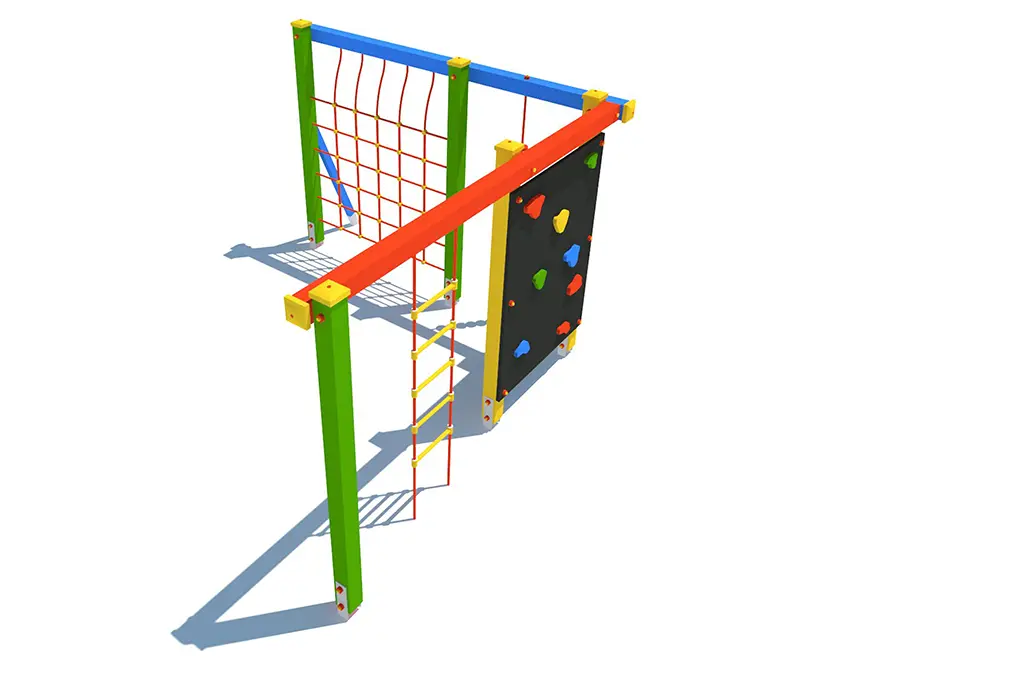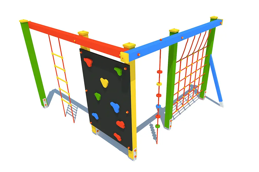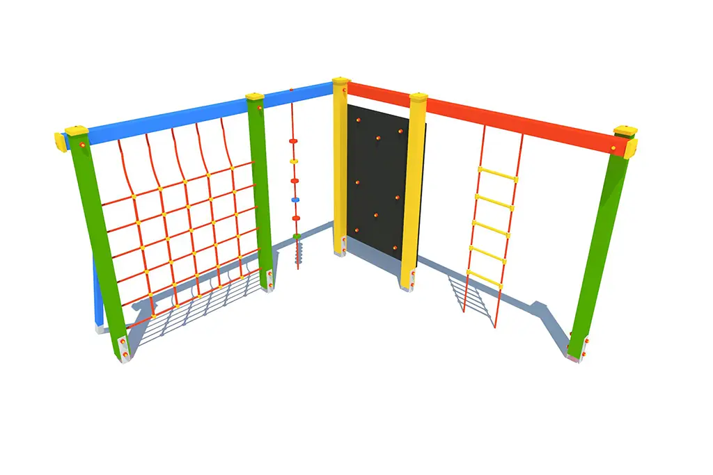 Zestaw wyposażony jest w różnorodne elementy: linę wspinaczkową 2 szt., pionową ściankę wspinaczkową, drabinkę linową, siatkę z liny, kratę drewnianą oraz dwa drążki metalowe. Dzięki nim dzieci mogą się wspinać, podciągać, balansować i przełamywać własne ograniczenia – a wszystko to w formie angażującej i bezpiecznej zabawy.
