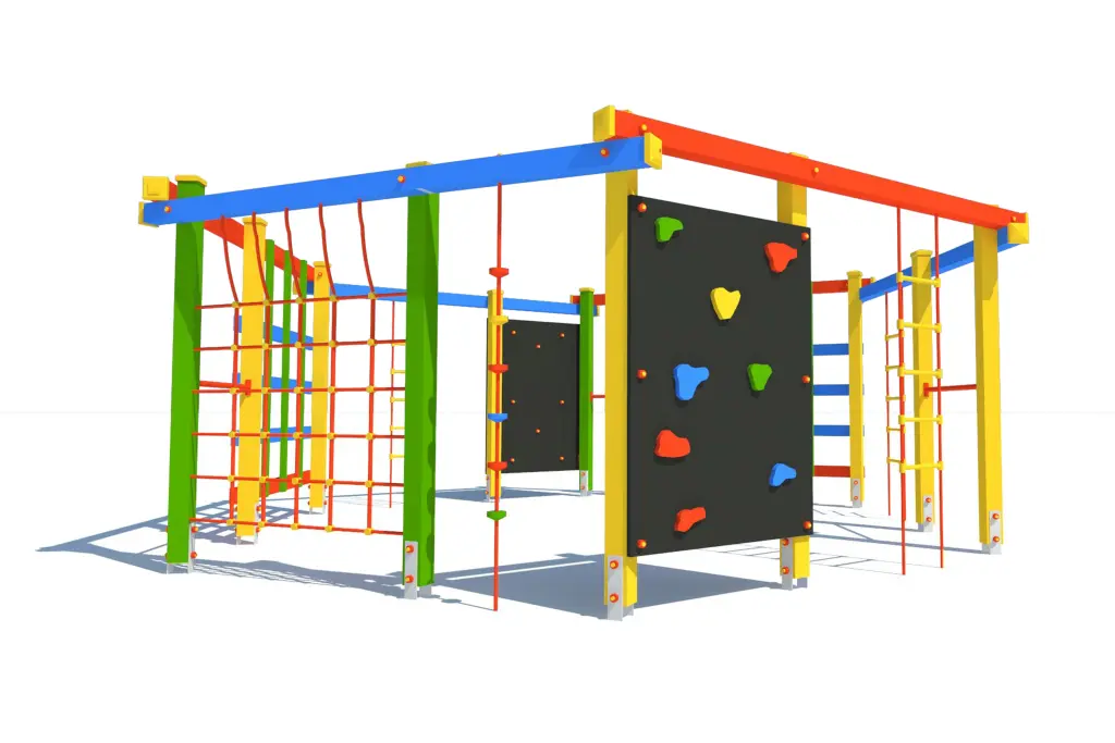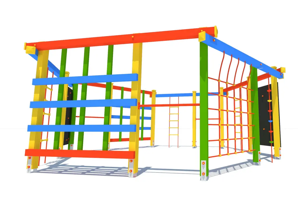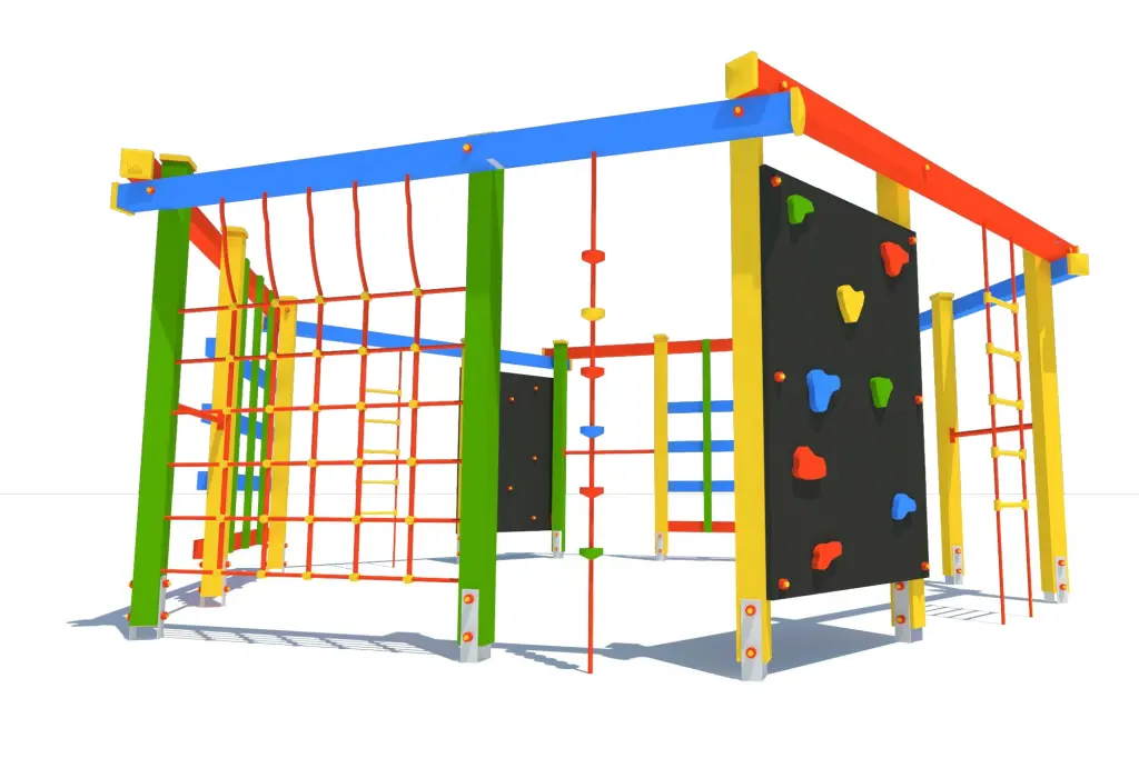 Zestaw wyposażony jest w różnorodne elementy: siatkę z liny, linę wspinaczkową, dwie pionowe ścianki wspinaczkowe, trzy drabinki linowe, dwie kraty drewniane oraz trzy drążki metalowe. Dzięki nim dzieci mogą się wspinać, podciągać, balansować i przełamywać własne ograniczenia – a wszystko to w formie angażującej i bezpiecznej zabawy.