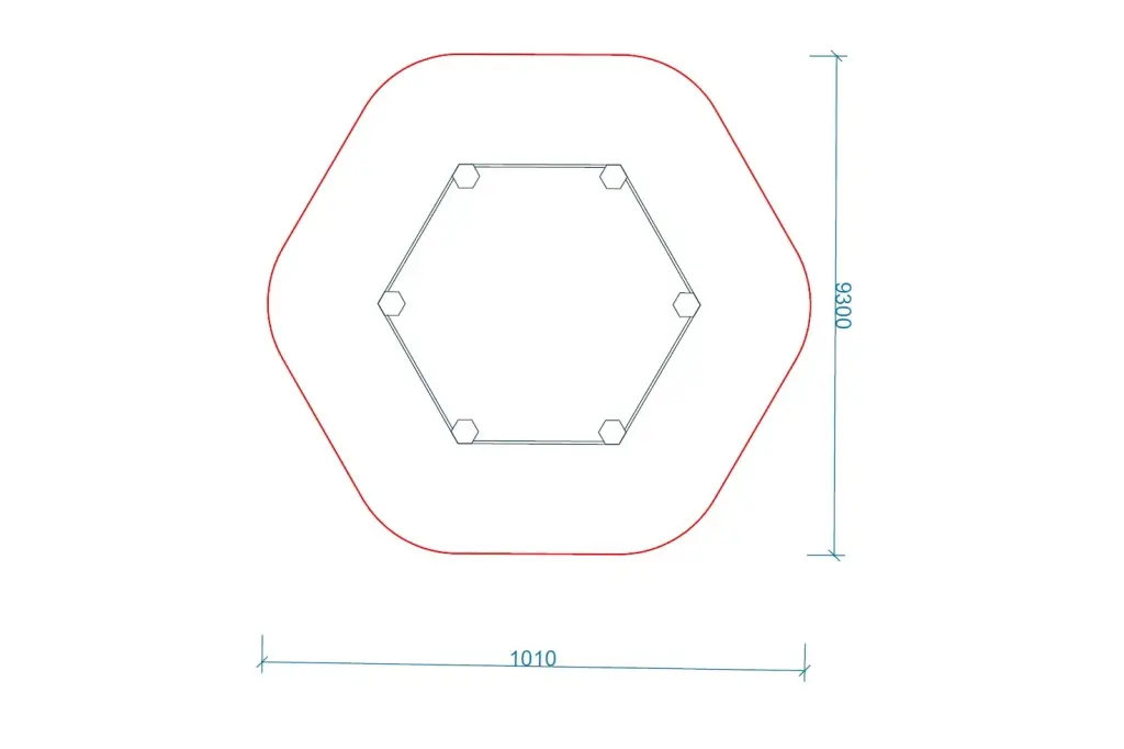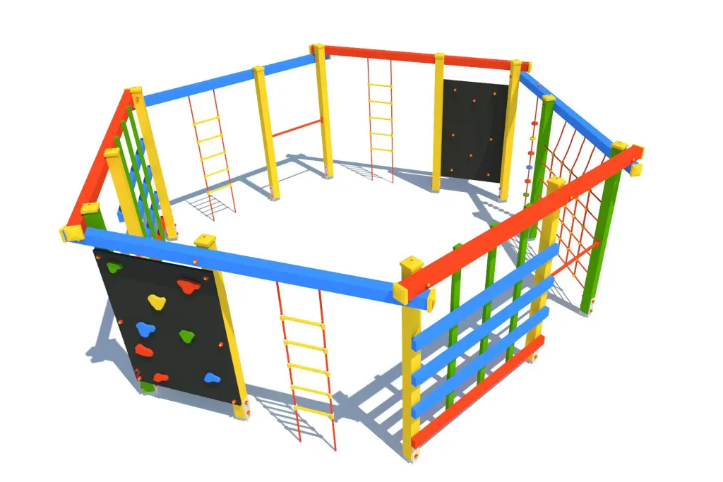 Urządzenie sprawnościowe SZEŚCIOKĄT DUŻY to nowoczesny i funkcjonalny element placu zabaw, stworzony z myślą o dzieciach w wieku od 3 do 12 lat. Jego konstrukcja zachęca do aktywności fizycznej, wspiera rozwój koordynacji ruchowej oraz buduje siłę i pewność siebie. SZEŚCIOKĄT DUŻY oferuje dużą powierzchnię do zabawy – 5,20 m szerokości, 6,00 m długości i 2,25 m wysokości, z wyznaczoną strefą bezpieczeństwa o wymiarach 9,30  x 10,10 m. Maksymalna wysokość swobodnego upadku wynosi 2,25 m.